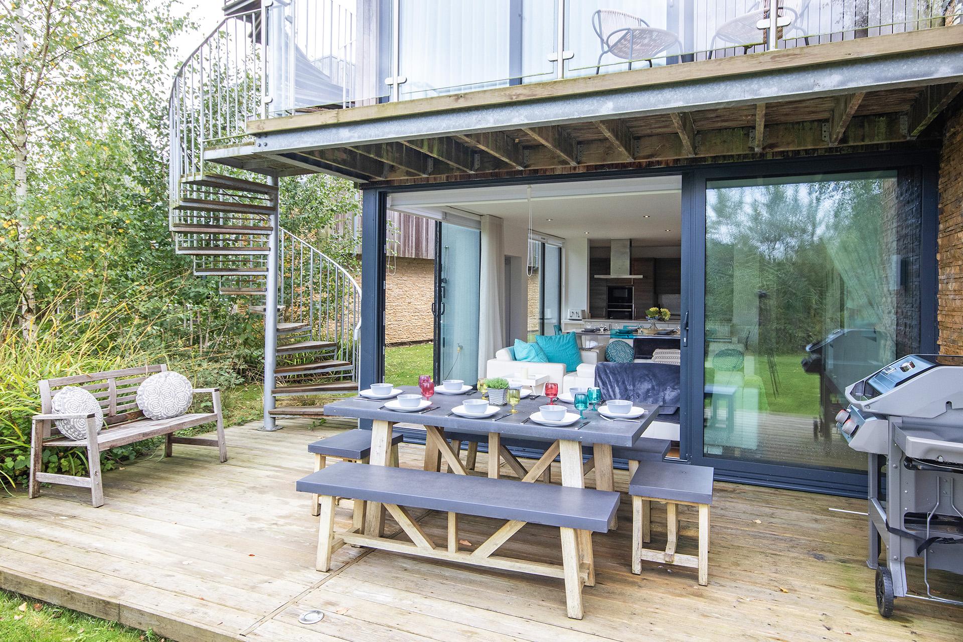 The large glass patio doors open from the living area to a terrace with dining table for 10, bbq & lawn that leads to a quiet garden area, the lake & private jetty from which you can canoe & paddle board on both Spinney and Minety lakes. Either bring your own canoes and paddleboards or hire them from the onsite activity hub.